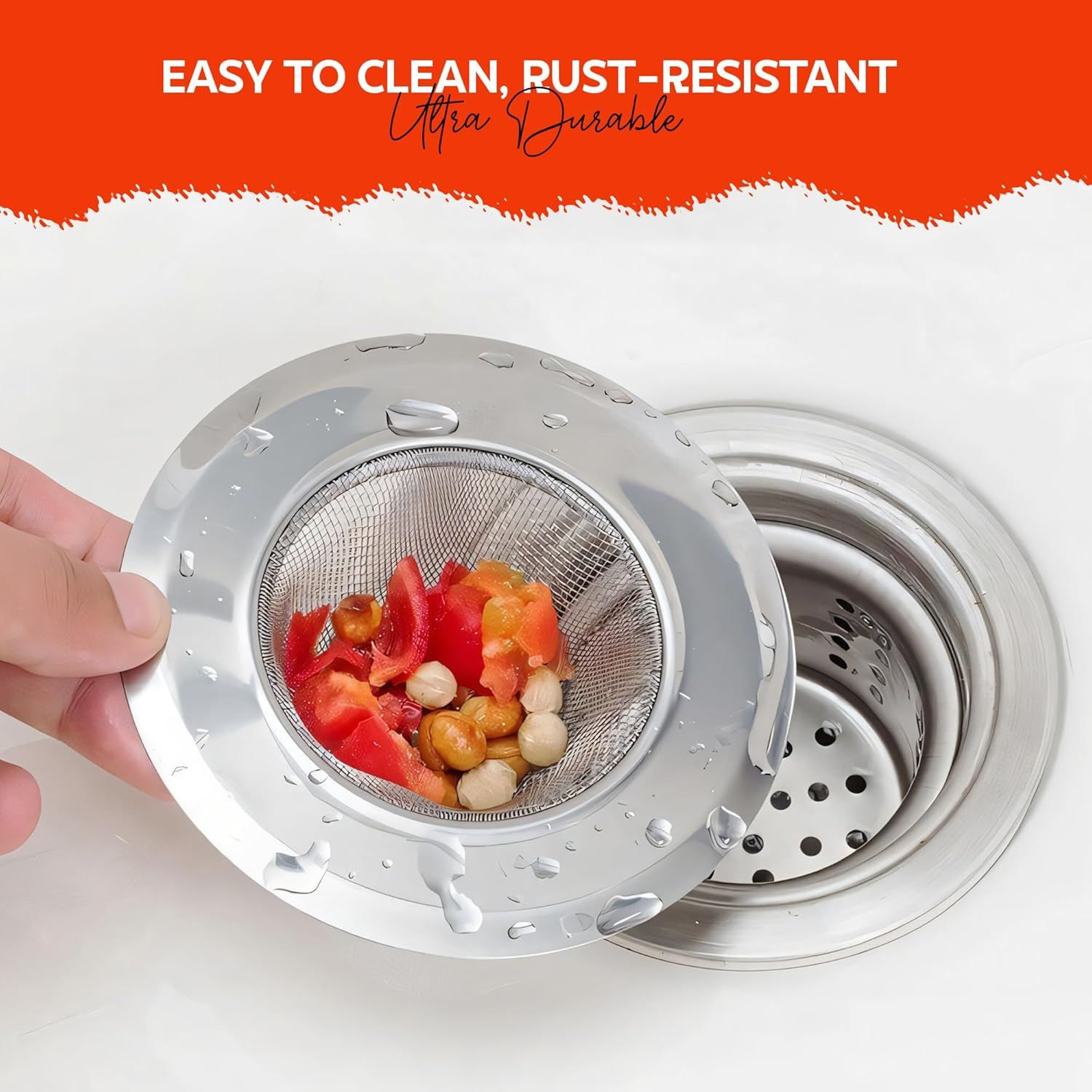 • EASY TO USE, CLEAN & MAINTAIN: This Single-Piece Drain Strainer Is Low-Maintenance; Simply Lift, Rinse, and Reuse; Can Also Act as a Sink Stopper for Kitchen Basin or a Drain Net When Needed